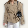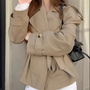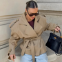 - Features: Double-breasted design, turn-down collar, button cuffs, and waist-cinching tie