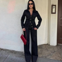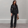 - Features: Button-up jacket with pockets, classic seam detailing, full-length flare jeans