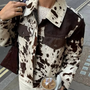 - Features: Bold cow print design, long sleeves, and functional patch pockets
