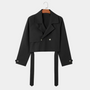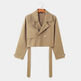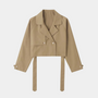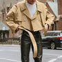 No need to stress over layering—this modern cropped trench elevates any outfit. Pair it with jeans, cargo pants, or leather trousers for a bold, urban look. The belted waist and sharp lapel details bring structure and edge, making it a versatile essential for your wardrobe.