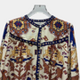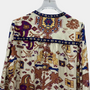 Features: All-over vintage floral print, decorative buttons, long sleeves, contrast collar, and V-neckline