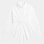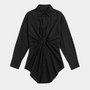 Features: Turn-down collar, twist front detail, long sleeves, mid-thigh length