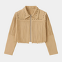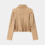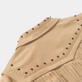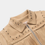 Channel effortless boho-western vibes with this studded fringe jacket. Crafted from soft, imitation suede (PU leather) in a warm champagne hue, it’s the perfect statement piece to elevate your casual or festival look—without breaking the bank.