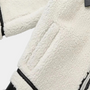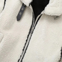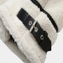 Features: White sherpa body with bold contrast trim, zip front closure, and stand-up collar with buckle detail