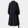 - Features: Double-breasted button closure, belted waist, notched lapels, and deep pockets